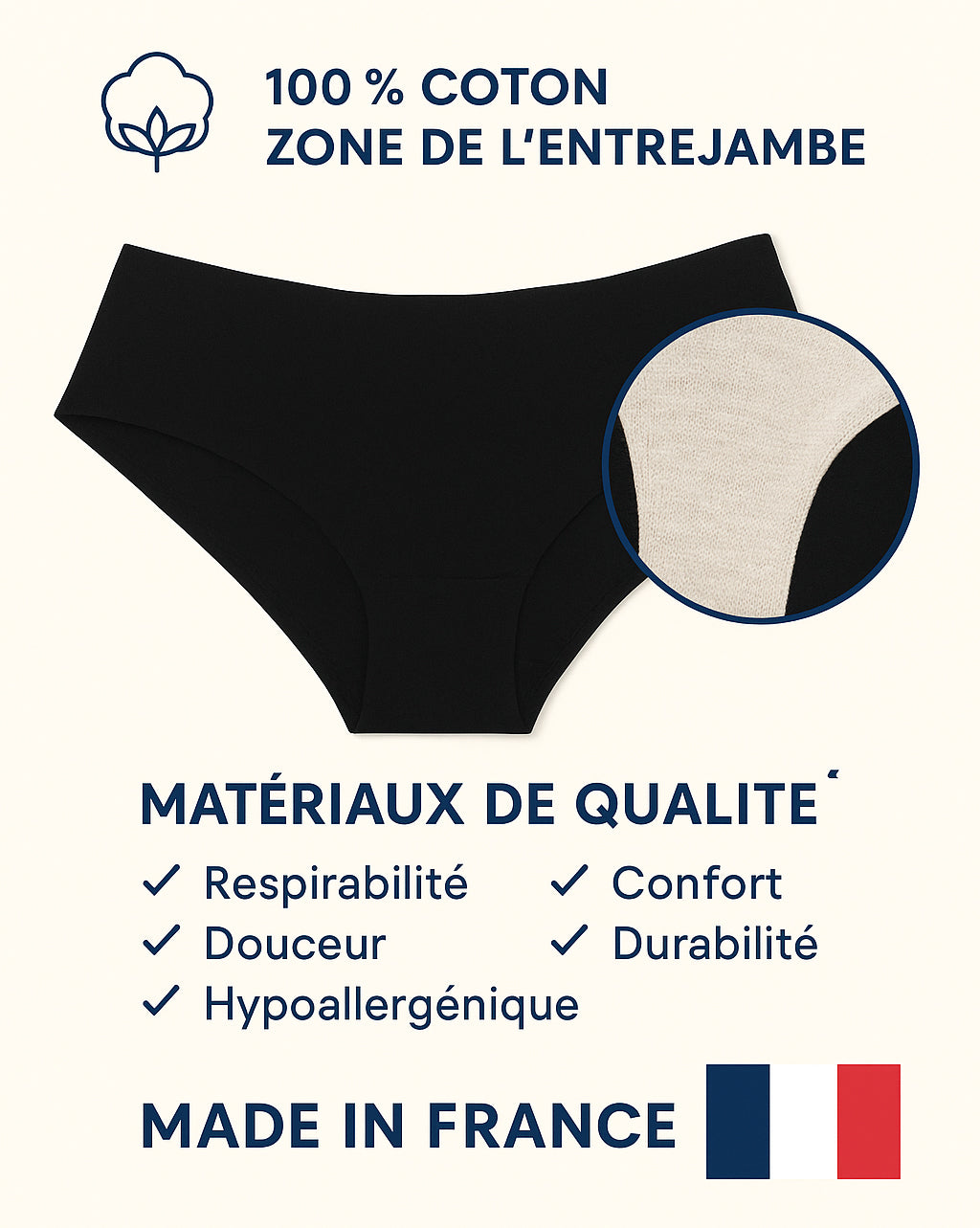 Gousset 100% coton respirant pour un bien-être intime optimal.